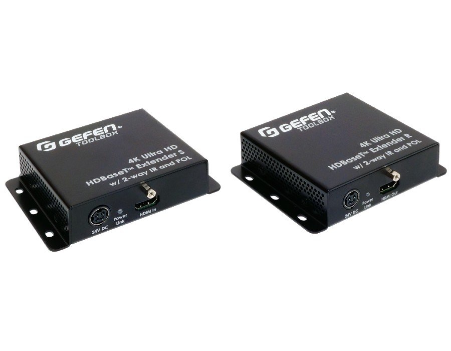 The GTB-UHD-HBTL 4K Ultra HD Extender uses Gefen’s implementation of the HDBaseT™ technology to extend HDMI up to 230 feet/70 meters at 1080p and up to 130 feet/40 meters at 4K, using one CAT-5e or better cable. Resolutions up to 4K Ultra HD (3840 x 2160 @ 60 Hz 4:2:0) with 7.1 channels of HBR (High Bit Rate) lossless digital audio are supported. This product provides 2-way IR extension between the Sender and the Receiver units, facilitating the control of A/V sources placed near the Sender unit and sending automation commands to the display or another device placed near the Receiver unit. Gefen’s Bi-Directional POL (Power Over Line) technology powers the Sender or the Receiver unit using the same cable that extends the HDMI signal. Only one of the two units will need a power supply. This feature simplifies installation in cases when an electrical outlet may not be available near the source or the display. Small, low profile enclosures can be securely surface-mounted and conveniently hidden away from sight.