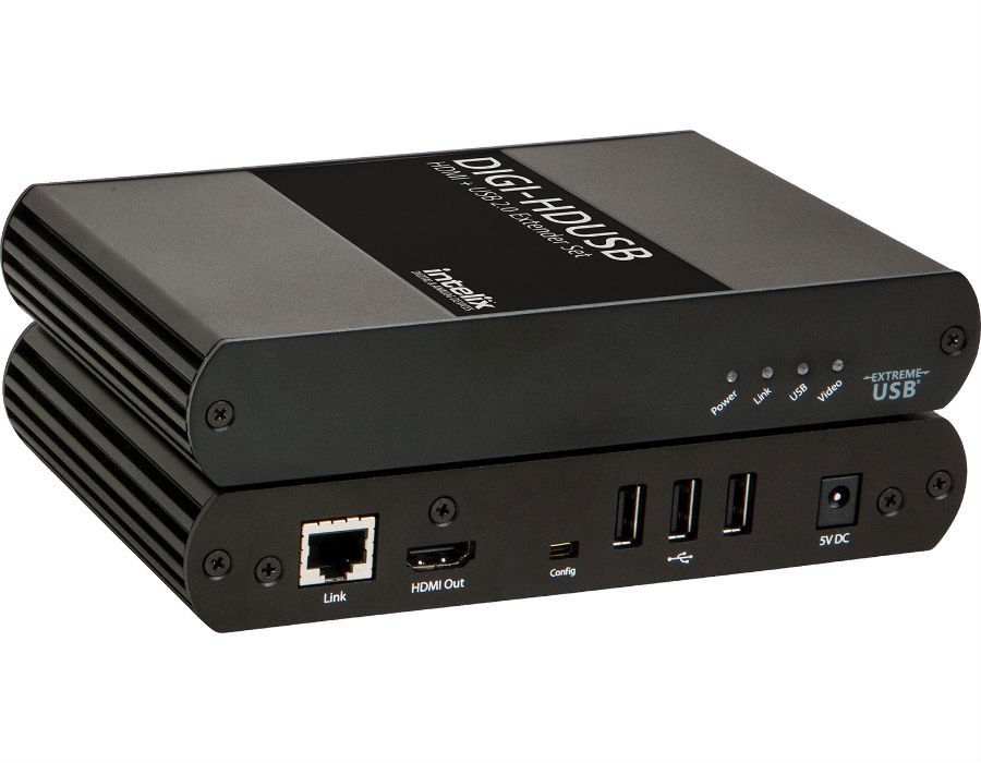 The Intelix DIGI-HDUSB extends HDMI and computer USB 2.0 signals up to 100m (330 ft) over twisted pair cabling. The DIGI-HDUSB 3-port USB/Video extender system supports full uncompressed HD video and USB 2.0 (up to 30Mbps) suitable for video applications in conjunction with keyboards, mice, and USB 1.1 web cameras. The DIGI-HDUSB supports HDMI video features such as 1080p, 4K, Deep Color and CEC/HDCP pass-through. The DIGI-HDUSB supports both USB 1.1 and 2.0 devices.
