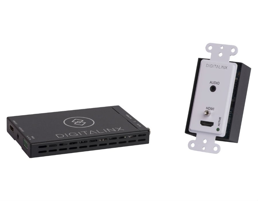 The Digitalinx DL-1H1A-WPKT-W HDBaseT extender set transmits HDMI, audio and RS232 over single category 6 twisted pair cable. The DL-1H1A-WPKT-W can transmit 4K resolutions up to 4K@60Hz, 4:2:0 up to 40m / 120’ and 1080P up to 70m / 230’. The audio circuit is completely separate and is not dependent on the HDMI input source to be active. The Digitalinx DL-1H1A-WPKT-W is HDCP 2.2 compliant. The DL-1H1A-WPKT-W HDBaseT receiver powers wall plate transmitter via HDBaseT so there is no need for an external power supply for the wall plate.