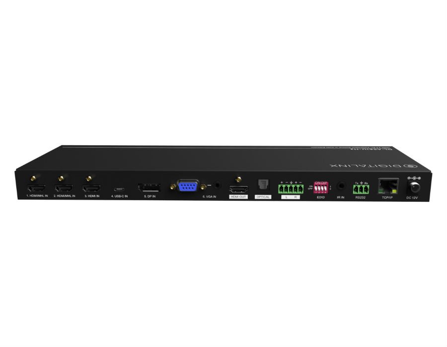 - HDMI 2.0 compliant 6×1 auto switcher with (3) HDMI, (1) USB-C, (1) VGA w/ audio, and (1) display port input and (1) HDMI output