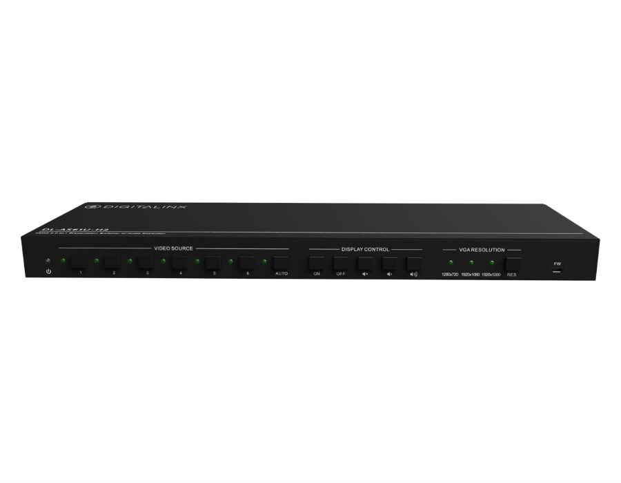 The DL-AS61U-H2 is a 6×1 HDMI 2.0b auto presentation switcher featuring three HDMI, one USB-C , one DisplayPort and one VGA input as well as one HDMI output. The first two HDMI inputs support MHL. This switcher supports video resolutions up to 4Kx2K@60Hz 4:4:4 / 8 bit deep color as well as HDR and multichannel audio. In addition to passing native EDID information from the display to an input on the switcher, there are multiple built-in EDID settings to choose from to simplify an installation. The switcher can de-embed digital and/or analog audio for audio reinforcement purposes which is de-embedded from the HDMI output. The switchers functions can be controlled by built in web server / GUI, IR remote, RS232, IP or by front panel button operation. Integrated CEC support for display control via front panel buttons is built in.