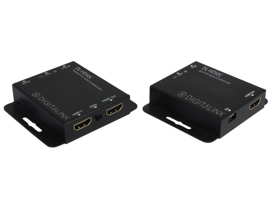 The DigitaLinx DL-HD50C is an HDMI Extender over Single Cat6 with IR up to a distance of 164ft/50m. The DL-HD50C features EDID management, which allows and encourages source and display “handshake” for seamless integration. Deep color video, 1080p High Definition resolution, DTS-HD or Dolby TrueHD audio are supported with this extender.
