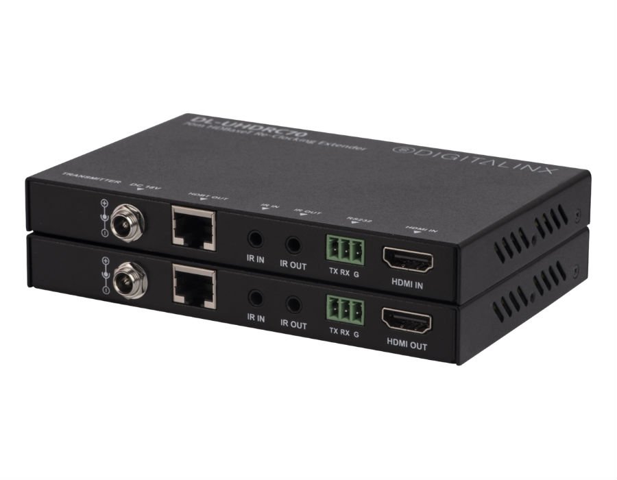The DigitaLinx DL-UHDRC70 is an re-clocking HDBT extender system that is compatible with source devices that does not support clock stretching such as older cable set top boxes. The DL-UHDRC70 can extend HDMI up to 70m / 230′ and also extends bi-directional IR as well as RS232. Supports 7.1 DTS Master HD and Dolby True HD.