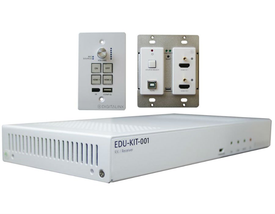 The Digitalinx EDU-KIT-001 is a multi-function AV distribution system designed to provide HDMI video switching, system control, video extension and analog audio amplification in a convenient kit. Utilizing the Valens Colligo VS2110 series chips, power, control, video up to 1080p, and audio are transported over a single 30m (98 ft) Category 6A cable between the wall plate transmitter and the receiver. The wall plate control module connects to the wall plate transmitter with a second Category 6A cable. All the power needed for the system is provided by the receiver. Additionally, the receiver features a built-in web GUI for control and analog audio de-embedding to a built-in 2×20 watt stereo amplifier.