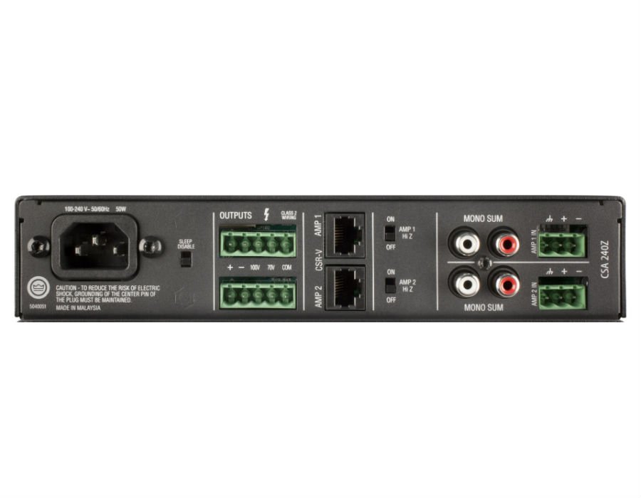 Supporting 70V and 100V installations out of the box, CS amps include RJ45 connectors for use with JBL CSR-V in-wall volume controls. Its universal power supply allows every CS amp to accept AC voltages from 100 to 240 VAC, 50/60 Hz.