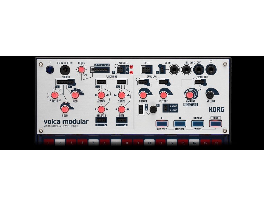 The volca modular is a semi-modular synthesizer consisting of independent analog synthesizer modules, digital effects, and a sequencer. Each of the modules has been carefully selected for independent operation. The modules are internally connected so it is possible to produce sound even before connecting the included pin cables, and the signal path is shown by white lines on the panel. The module connections through a pin cable take priority over the internal connections, bridging them.