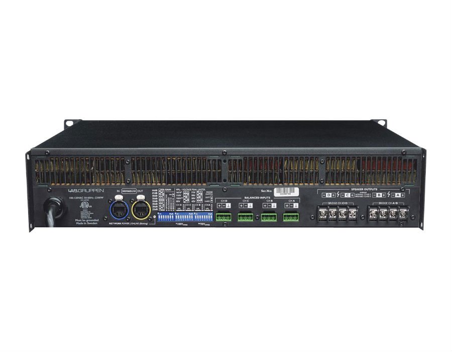 This amplifier is uniquely capable of adapting to a wide variety of demanding load conditions. Each channel has an individually configurable Voltage Peak Limiter (VPL™), which allows the output to be optimized for any loudspeaker load – whether a single large subwoofer or a series of small 70 V loudspeakers (100 V in bridge mode). VPL works in combination with adjustable input gain (adjustable in 2-channel blocks) to achieve maximum headroom regardless of input levels or output impedances. Additionally a 35 Hz high pass filter may be inserted in each 2-channel section.