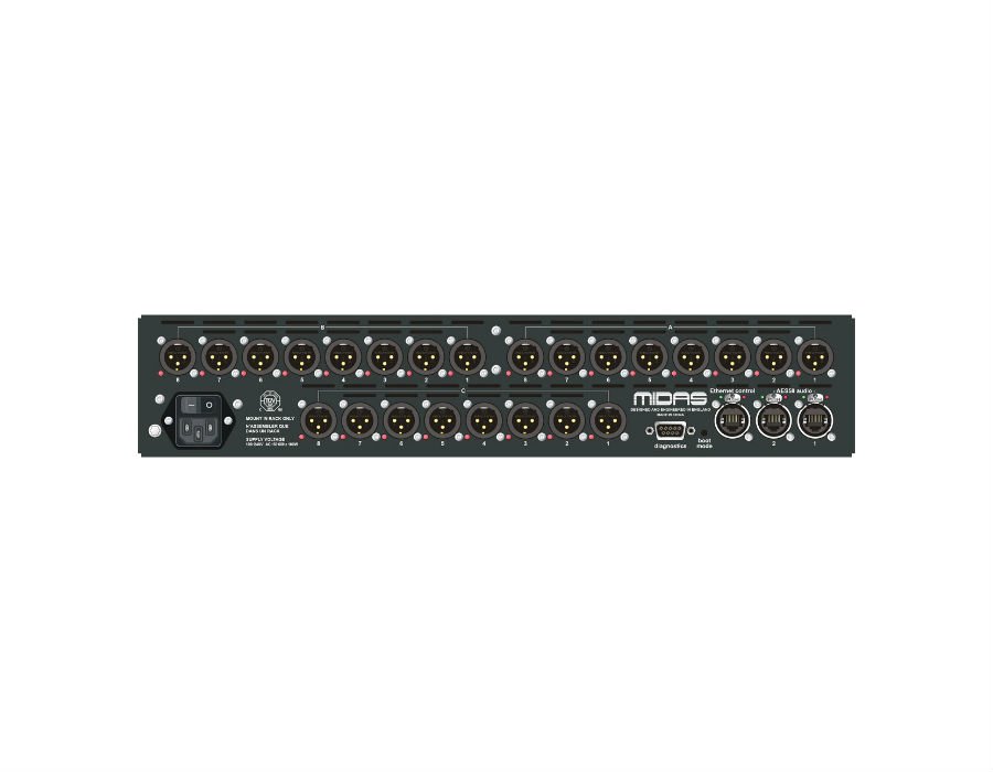 The interface unit shall be designed for digital audio mixing applications and be optimised for use in live performance. It shall feature 16 integrated microphone preamplifier inputs with 2.5 dB analogue gain steps and 48 servo-balanced electronic outputs on industry-standard XLR connectors and shall be capable of operating at 48 kHz and 96 kHz sampling rates.