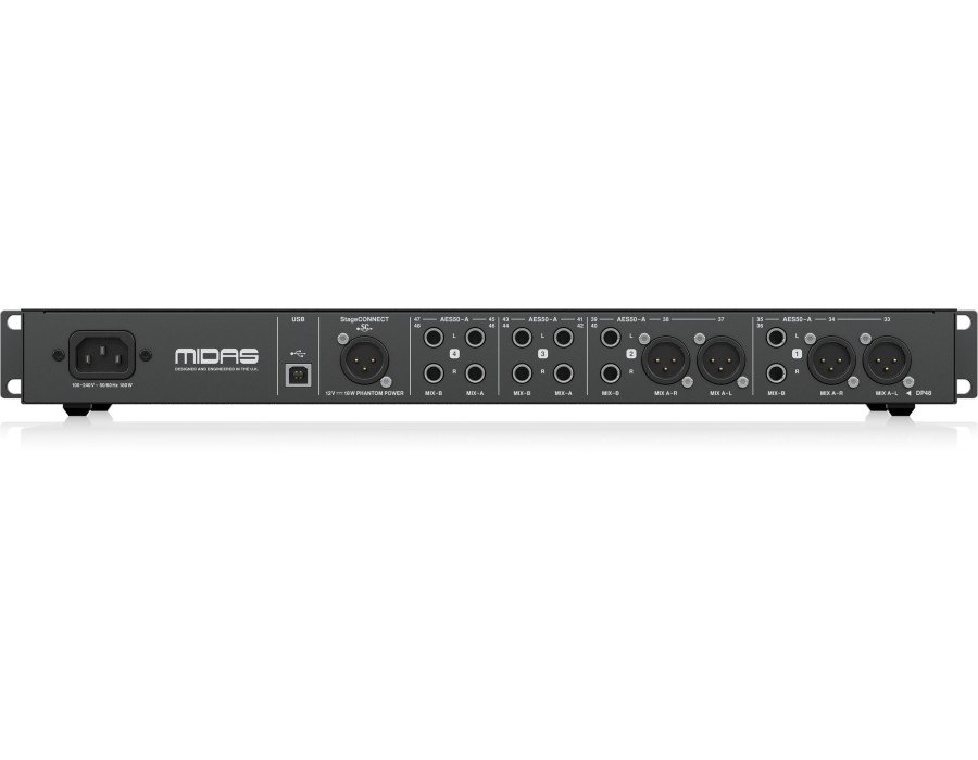 Midas HUB4 is the multi-tool in your stage rack providing analogue and digital outputs for various applications. HUB4 can supply up to four DP48 personal monitor mixers with PoE (Power over Ethernet) and 48 channels of 24-bit / 48 kHz audio. HUB4 also collects 48 channels of upstream audio and forwards this audio to the FOH console, either from stage boxes connected to the AES50-B (THRU) Port or 8 return channels from each of Ports 1-4.