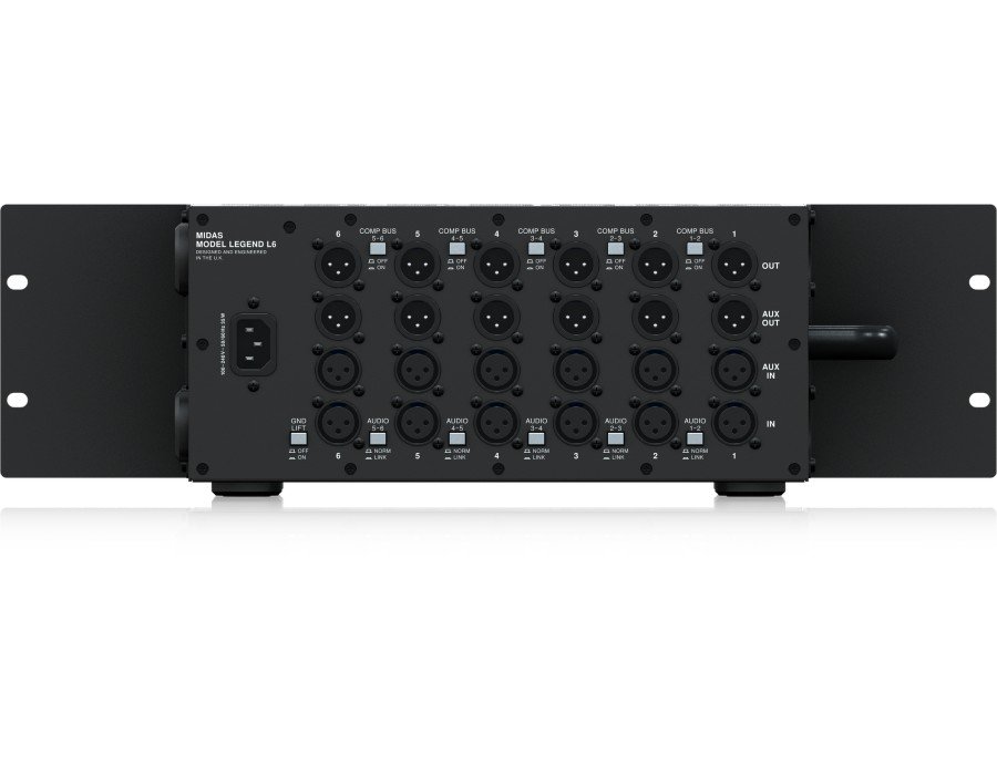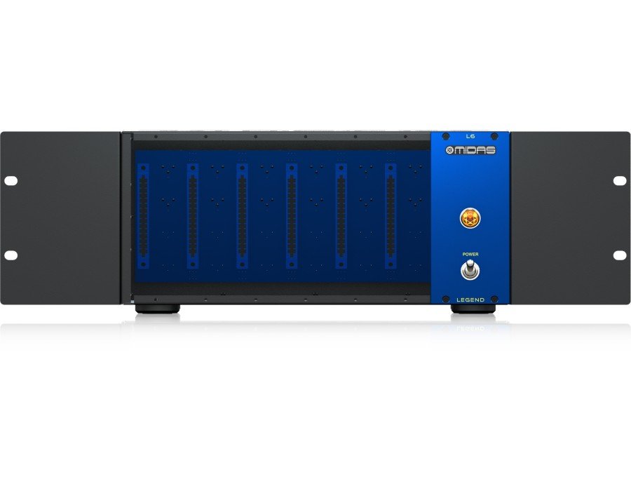 The L6 chassis provides I/O connectivity and +48 V phantom power for up to 6 processing modules in a rugged steel cabinet that occupies only three 19″ rackspaces (when fitted with the included rackmount kit).