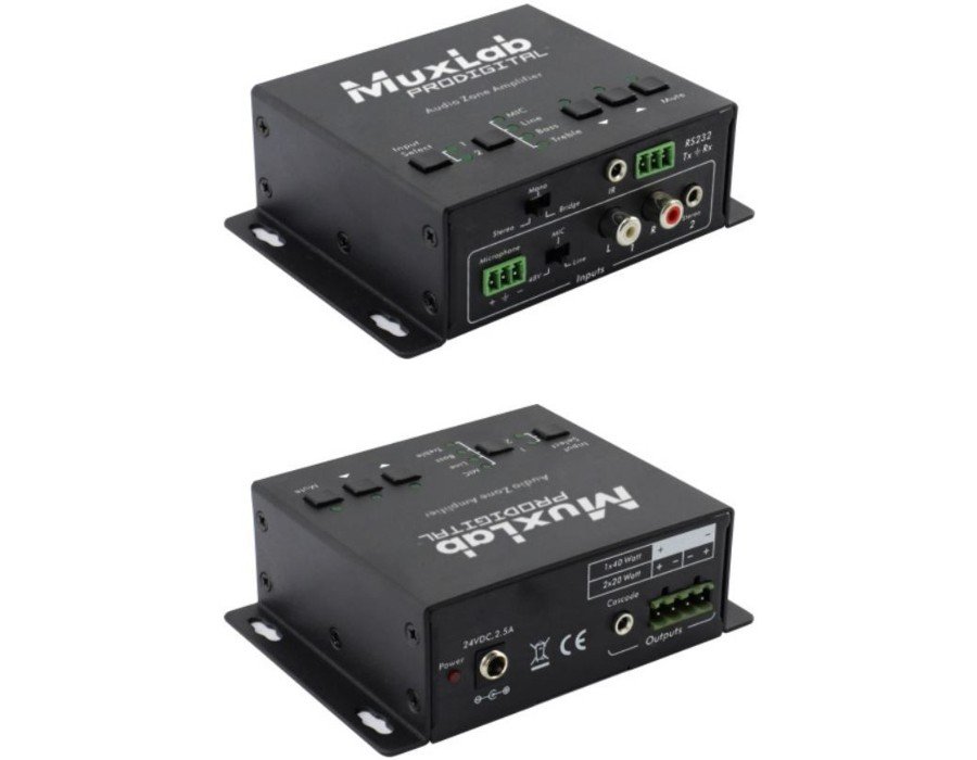 The MuxLab 500216-US Audio Zone Amplifier is a Class D digital amplifier that allows one (1) analog source to be distributed to a pair of 20W per channel stereo speakers within a zone. The Audio Zone Amplifier can be cascaded infinitely across multiple zones to give a multi-room audio solution.