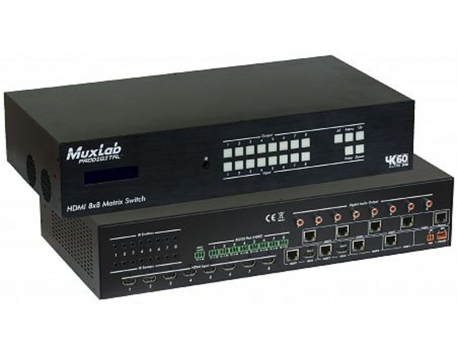 The HDMI 8×8 Matrix Switch, HDBT, 4K/60 allows up to eight (8) different HDMI sources to be connected and/or distributed to up to eight (8) + two (2) HDMI displays. The unit supports eight (8) HDBT outputs, plus the first two (2) outputs also include two (2) HDMI outputs for local connectivity. The HDMI 8×8 Matrix Switch, HDBT, 4K/60 is compatible with the MuxLab 500454-PoE-RX HDBT Receivers. and supports distances up to 70m at 1080p and 40m at 4K via Cat5e/6 cable. Management functions include front panel push button, IR, RS232 and IP. Software updates are supported via a USB port.