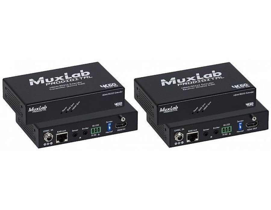 The Muxlab 500459-100 HDMI/RS232 100m Extender Kit, HDBT, 4K/60 allows HDMI equipment to be connected up to 230ft (70m) at 4K/60 (4:4:4) resolution, or 330ft (100m) at resolutions up to 1080p via one (1) Cat 5e/6 unshielded twisted pair cable in a point-to-point configuration. The unit is HDCP 2.2 compliant and supports HDR, as well as RS232 and bidirectional IR pass through transmission for end device remote control. This HDMI extender 4K supports PoC, allowing the transmitter to power the receiver, or the receiver to power the transmitter.