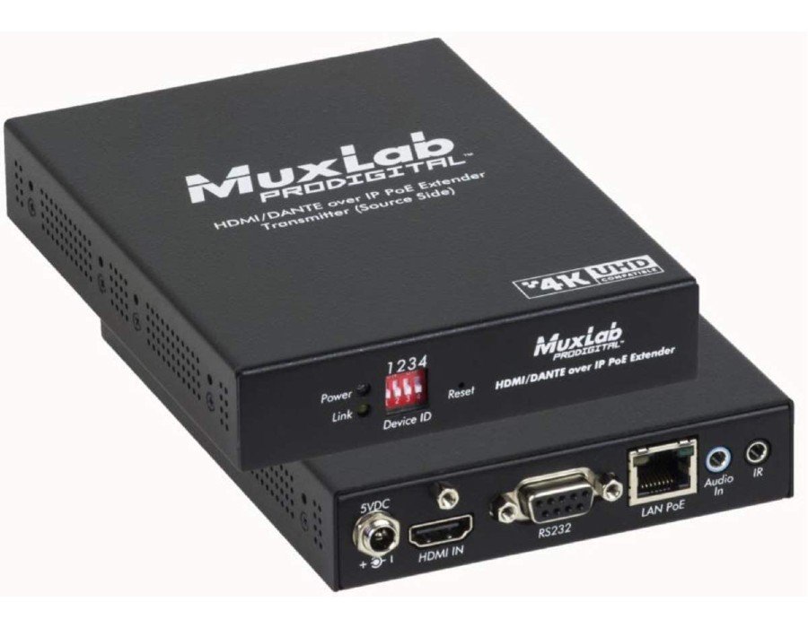 The Video Wall 4K over IP PoE Extender Kit allows HDMI equipment supporting up to 4K @ 30Hz or 1080p at 60Hz resolution to be connected and extended to create a Video Wall of user configurable size (X by Y) supporting 100’s of screens, depending on network bandwidth, utilizing one Receiver for each display in the array. Each Transmitter (500759-TX) and Receiver (500759-RX) can be connected via Cat5e/6 cable up to 330ft (100m) from an Ethernet Switch. The Transmitters and Receivers support PoE (PD) and may be powered by a PoE (PSE) Ethernet Switch. The kit comes with one (1) Transmitter and one (1) Receiver. The IR Emitter and IR Sensor, if required, may be purchased separately for IR based remote control applications.