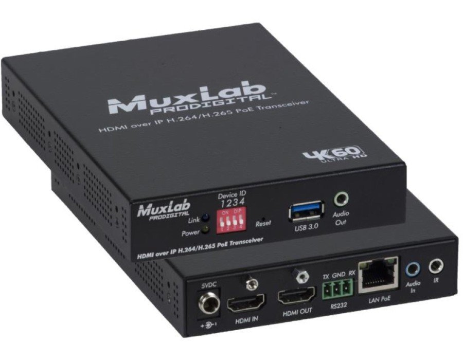 The Muxlab 500764-TX HDMI over IP H.264/H.265 PoE Transmitter, 4K/60 allows HDMI source equipment to be extended locally up to 330ft (100m) at up to 4K @ 60Hz resolution via Cat5e/6 cable and is compatible with the Muxlab 500762-RX Receiver to support point-to-point, point-to-multipoint and multipoint-to-multipoint configurations, Video Wall and Multiview capabilities in a low bandwidth expandable and cost effective manner, without the need to install dedicated cabling systems. The exceptionally low bandwidth requirements of this device in the H.264/H.265 video codec setting allows for streaming audio/video content over a local network, and over the Internet for distributed installations spread throughout the globe. The unit also supports a MotionJPG (MJPG) video codec setting for low latency applications. The transmitter accepts a 4K video @ 60Hz and streams the content to an H.264/H.265 Receiver, such as the MuxLab 500762-RX, to be displayed on a 4K monitor. The Transmitter may also send H.264/H.265 video streams to other H.264/H.265 compatible Receiving devices. The device supports PoE (PD) and may be powered by a PoE (PSE) Ethernet Switch.
