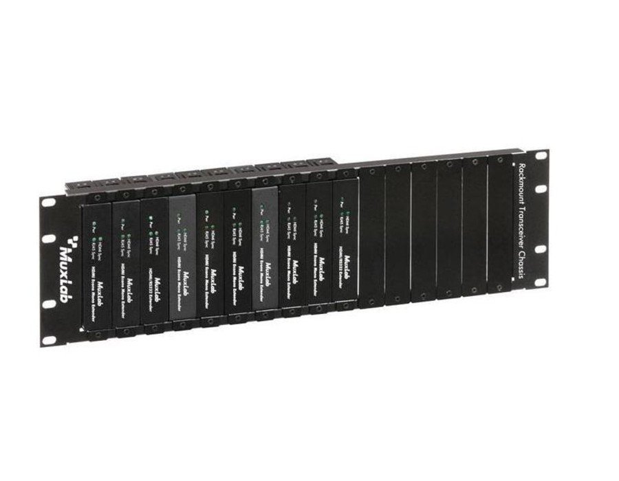 The 16-Port Rackmount Transceiver Chassis is designed as a head-end cable management solution, allowing any combination of up to sixteen (16) MuxLab Transceivers to be installed in a standard 19??? telecom relay rack. Head-end AV equipment such as DVD players, video servers and cable boxes may be installed in a local wiring closet and connected to the Cat5e/6 structured cabling system via a wide array of MuxLab Transceiver solutions. The Transceiver may be installed in either front or rear- facing orientation depending on the application. Blank filler plates can be ordered separately in quantities of four (4) (P/N: 500921). Mounting brackets for mounting 16 Transceivers to the rack are included, but additional brackets can be ordered separately in quantities of four (4) (P/N: 500922) for mounting two (2) transceivers to the rack.