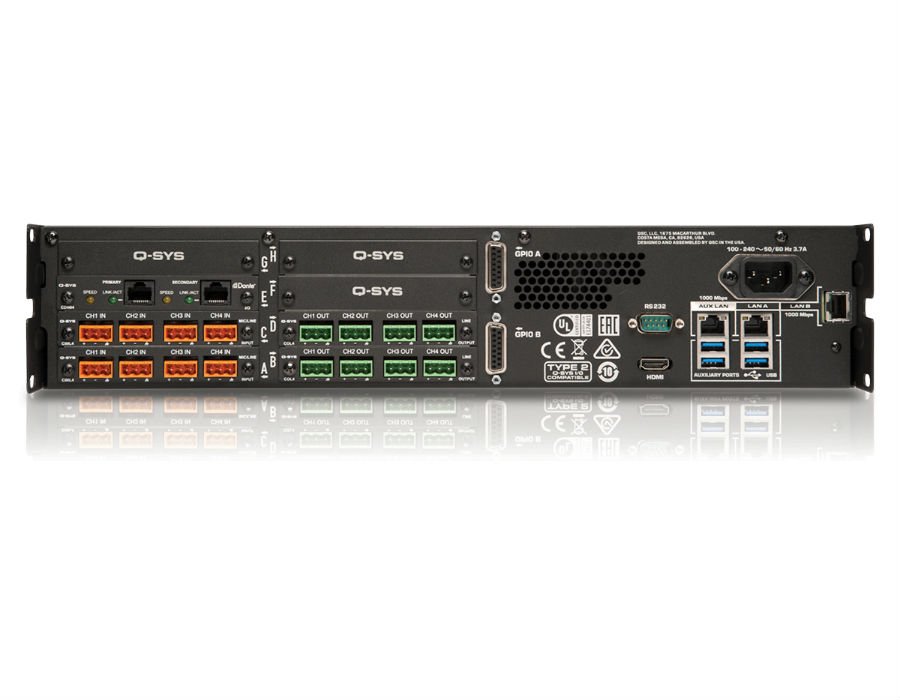 - Q-SYS Core Mode: Provides an abundance of raw processing power for all audio, video and control processing requirements including integration with the new Q-SYS AV-to-USB Bridging solution and onboard acoustic echo cancellation (AEC) processing, allowing the ability to manage multiple small- to mid-sized conference spaces or a single large space.
