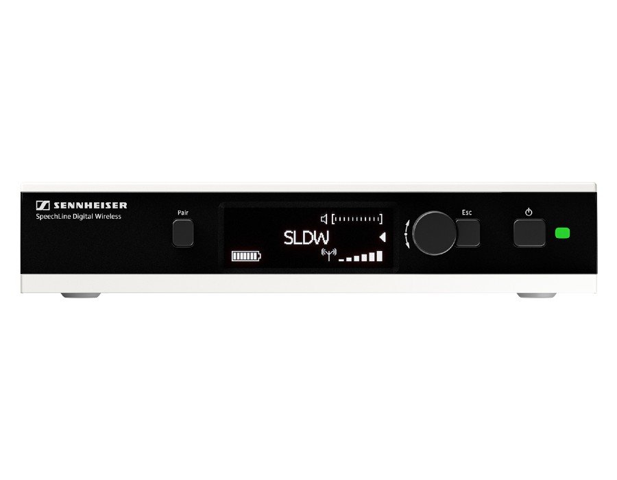 The half 19″ stationary SL Rack Receiver DW is the easy-to-integrate core of the SpeechLine Digital Wireless System. It features a clear visible OLED display for easy setup and operation. Thanks to the bi-directional communication all settings of the mobile transmitters can be adjusted from the receiver side. The automatic frequency and interference management allows convenient and reliable operation. Thanks to the easy-to-handle pairing process, the transmitter and receiver are securely linked. Via network integration all settings and statuses are also accessible via AMX/Crestron media control protocol and the dedicated Sennheiser iOS Apps. The antennas can be either back or front-mounted.