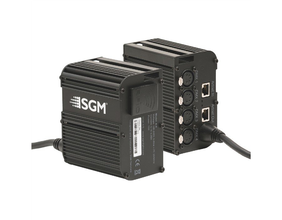 The A-4 is a multi-purpose ArtNet DMX node/recorder/player combined with monitoring features. With the A-4, fixtures become remotely accessible via RDM, allowing you to program, upload, and schedule your show from a remote location, when connected to the Internet. It also works as a remote monitoring device, notifying the technicians of any irregularities within the fixtures. Since all the outputs are assignable, the A-4 can work as a regular ArtNet node, a DMX splitter with configurable outputs, and a RDM setup device.