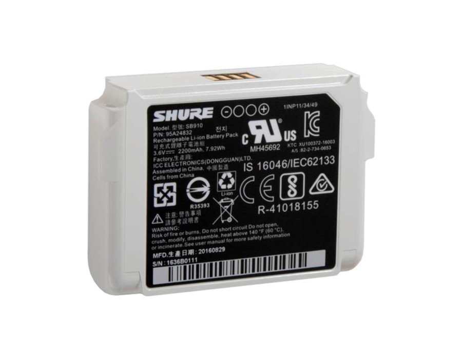 The SB910 Battery for ADX1 and ADX1 LEMO 3-Pin Transmitters from Shure is a rechargeable battery for the ADX1 bodypack transmitter. It offers up to 10 hours of runtime when fully charged.