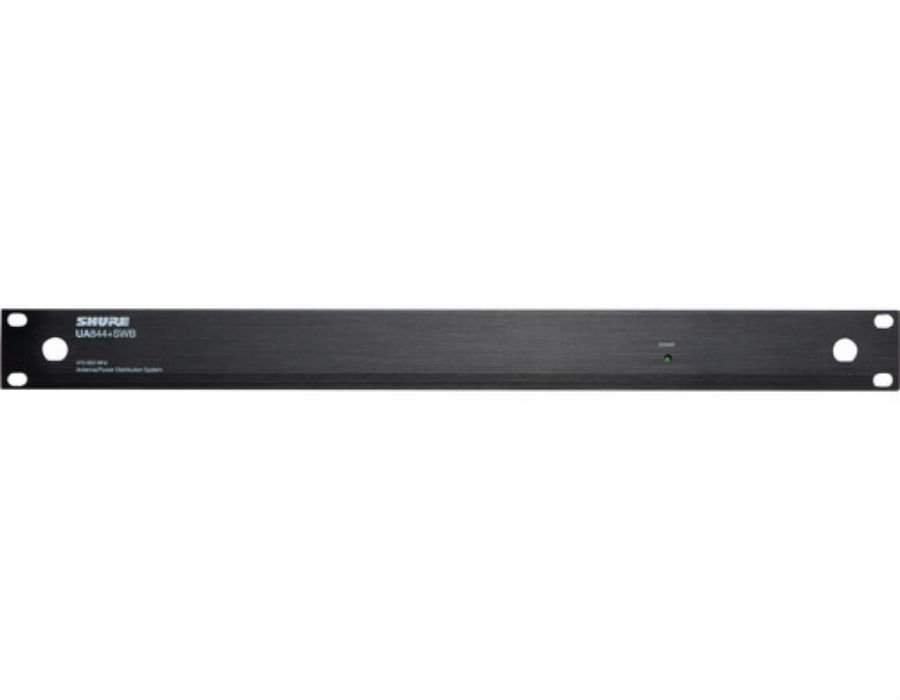 The UA844+SWB UHF Wideband Antenna Distribution System from Shure is for the expansion of a Shure wireless microphone system. It can be used to split one pair of antennas to multiple receivers and amplify the RF signal to compensate for the insertion loss.