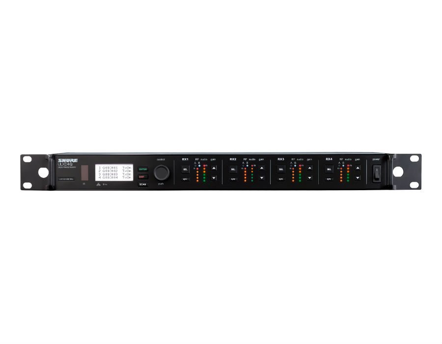The Shure ULXD4Q Quad Channel Digital Wireless Receiver offers four channels of uncompromising audio quality, RF signal stability, and advanced setup features in a space-efficient single rack unit. Rugged yet lightweight and compact, the 1RU all-metal chassis houses four independent receivers, each with its own audio and RF meters, gain control, and XLR outputs that can be either direct or summed for flexible signal routing.