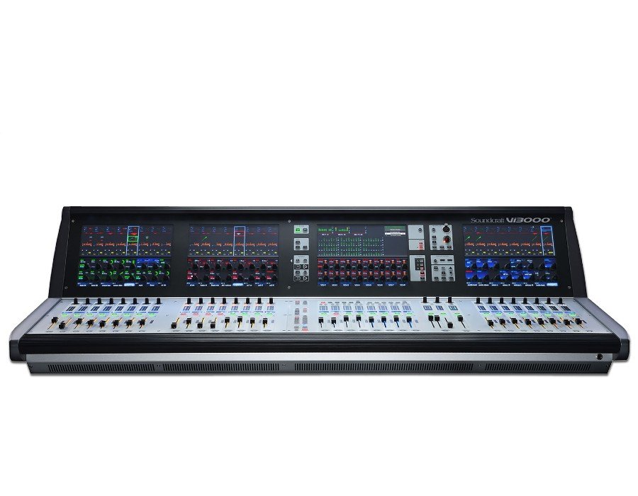 The Soundcraft Vi3000 features an all-new appearance with a more efficiently designed control surface, 36 faders, 24 mono/stereo busses and a sweeping black screen panel with four Vistonics II™ touchscreen interfaces with sleek, updated 3D graphics. Because the Vi3000 has four touchscreens, it’s the only console in its class that can be used by two engineers at the same time.