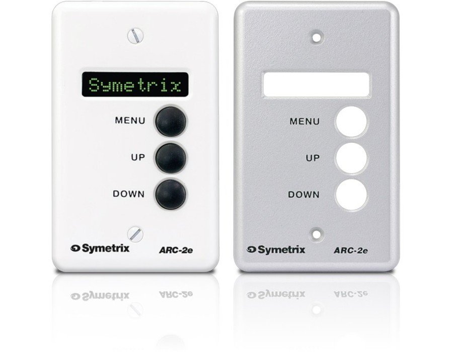 The ARC-2e is a menu-driven remote control for Symetrix DSPs with 24 menus each with up to 16 items used to control multiple basic functions or complex logic-based events including volume, presets, source selection, room combining and more. The 8-character backlit display supports up to thirty-one scrolling characters, providing user feedback for control assignments, default settings, and actions. The three buttons navigate menus, adjust parameters, and enable or disable the wall panel. The ARC-2e mounts in a single gang electrical box (US).