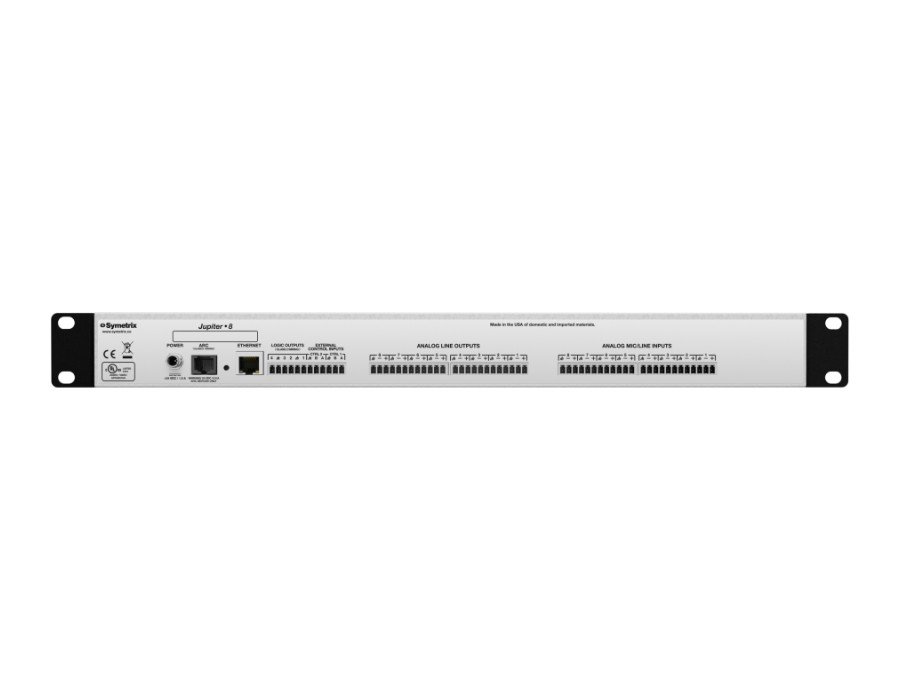 The device shall provide twelve, eight or four inputs (Jupiter 12, 8 or 4 respectively) that are selectable as line or mic level with phantom power and four, eight or four (Jupiter 12, 8 or 4 respectively) line level outputs. All signal processing, mixing and routing functions (including input gains) shall be controllable via software. Audio inputs and outputs shall be accessed via rear panel 3.81 mm terminal block connectors.