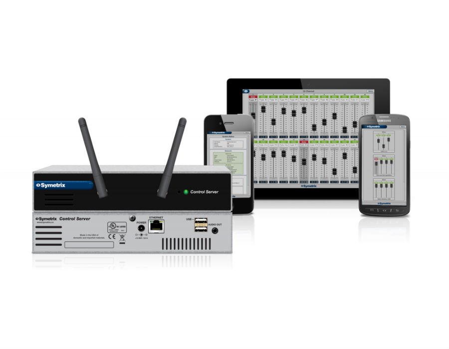 Control Server is a web services platform for control of network AV systems, including Symetrix Radius, Edge, Prism, and Solus NX DSPs. Programmed using Composer, Control Server offers wired connections for the A/V network and built-in wireless (Wi-Fi) connectivity for control. Administer and operate from any web-connected computer or mobile device, such as tablets and smartphones. The web-based, multi-touch-enabled Symetrix app provides a user-friendly front end for user control functions.