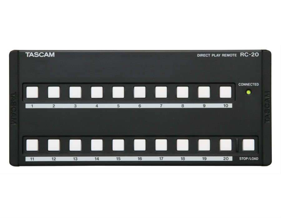 20 pushbuttons for Direct Play and a Stop/Load button include space for legend strip are housed in a compact case under 9”¥» wide and available at a price never before possible. For theater, broadcast, PA or other installations where price and space are limited, the RC-20 and TASCAM player are an unbeatable combination.
