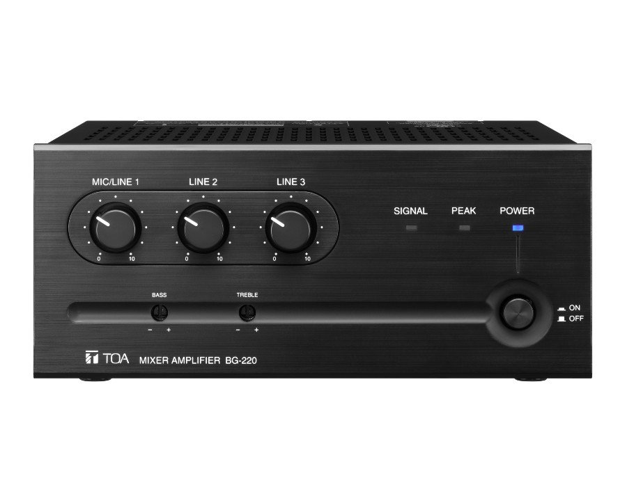THE TOA BG-200 SERIES MIXER/AMPLIFIERS are ideal solutions for installations in restaurants, retail stores, lounges, classrooms and meeting rooms. Incorporating TOA’s no-compromise technology, the new BG-200 Series are designed to provide the high performance and audio quality with wide frequency response, low noise and distortion and stable output regulation.