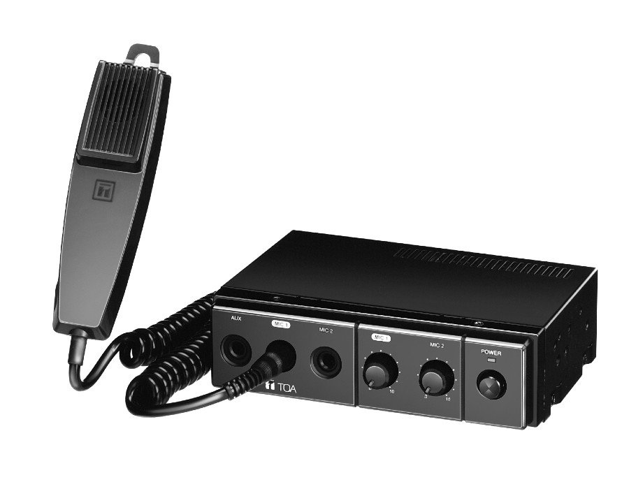 TOA CA SERIES MOBILE MIXER/amplifier are ideal for remote applications requiring a compact and powerful mixer/amplifier for public address or emergency paging. Three CA Series models, the CA-115 (15 W), CA-130 (30 W) and CA-160 (60 W) are each powered with a standard 12 Volt DC battery and operate into four or eight ohm speaker loads. All models include two microphone inputs with individual volume controls, a handheld microphone with talk switch, and an auxiliary input for connecting an external CD player, radio, tape deck or tone generator. All mounting hardware is included for easy installation under dashboard or into a standard console cutout. The CA Series Mobile Mixer/amplifier are backed with a five year warranty.