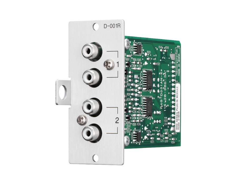 The D-001R is a line input plug-in module designed for use with the 9000 Series amplifiers. It has 2-channel unbalanced inputs of RCA jacks. Input signals to both channels are mixed together. The D-001R can process effect for TONE/EQ/COMPRESSOR to two inputs independently.
