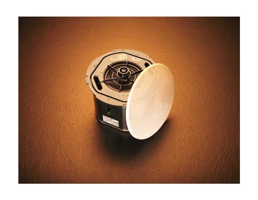 Its two-way, bass-reflex speaker system is designed to provide exceptional lows and clear highs with high power handling capability. It is ideal for locations that have high ceilings or require true-to-life sounds. The uniform sound output levels are achievable not only in the position directly under the speaker, but also over a wide radius. (Coverage angle is approximately 110°.) Because the speaker provides both low- and high-impedance operating capability, it can be used in many different applications. A front panel-mounted input selector switch permits easy verification and change of current impedance/power settings, even after installation. It can be quickly and accurately mounted to ceilings and has a rotating front grille that can be installed/removed quickly and conveniently. It has an attractive exterior design specially created by an interior designer to blend naturally with any architectural space. Optional mounting hardware permits installation in weak ceiling panels.