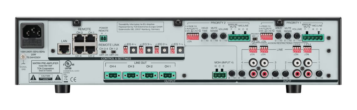 The MM-700F matrix pre-amplifier performs matrix controls from 4 LINE plus 2 MIC/LINE level inputs to 4 output channels. Each output channel features 64 DSP preset selections for general equalizations, crossover for sub-woofers, or a variety of TOA speakers’ EQ settings. 2 MIC/LINE inputs have 1st and 2nd priority levels which can override assigned output channels automatically or manually. If connected with optional WP-700-AM wall remotes via shielded CAT-5 cable, audio source selection and volume controls can be done remotely. All assignments and setups can be done by dip switches on its rear panel without a laptop or a PC. This unit fits a wide range of applications that require multi-zone paging and/or background music distribution at restaurants, retail stores, factories, and many other venus.