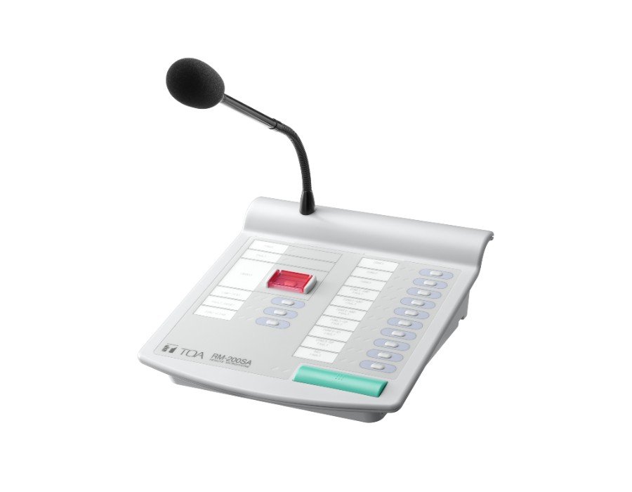 The RM-200SA is a remote microphone designed for the Matrix System. It is equipped with 13 function switches that can be used to select individual zones or zone groups a covered switch and corresponding indicators. The optional RM-210 Remote Microphone Extension permits switches and indications to be expanded in 10-piece units.