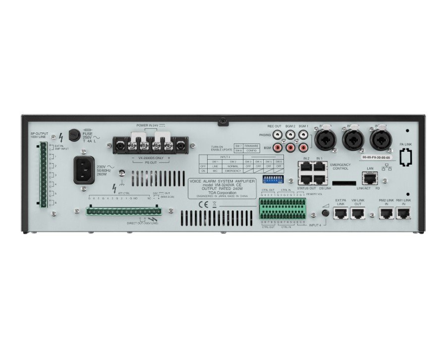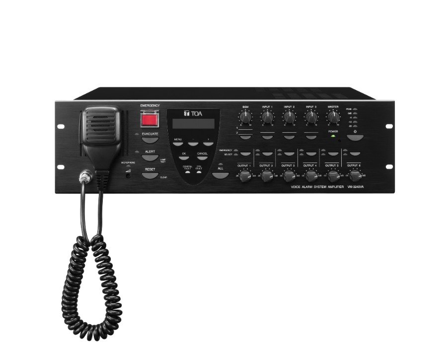 The VM-3240VA Voice Alarm System Amplifier is a multifunction amplifier that comes with audio inputs including a background music input, and a speaker output section which has an internal attenuator and a 6-output selector. It permits not only general-purpose broadcast, but also Emergency broadcast which gives pre-recorded instructions in an emergency situation. Emergency broadcasts can be made from am optional RM-300MF Fireman’s Microphone as well as from the amplifier, and can be remotely controlled from external equipment. In addition, the unit features a surveillance function which automatically checks the system for failures.
