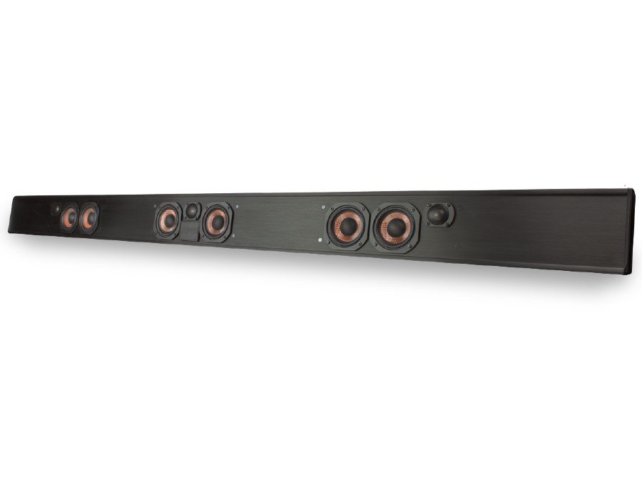 Custom length thin soundbar, built to match any display width between 41.5″ – 62″. 4.5″ injected polypropylene woofers, 1″ silk soft dome tweeters.