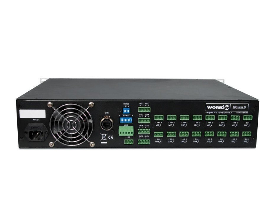 Digiline 8is the most complete unit: in addition to processing features, it includes a powerful amplifier with 8 independent channels of 150 W each.