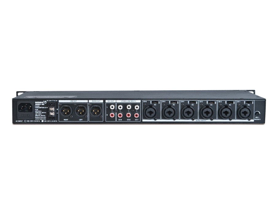 MMX 62 has two types of balanced outputs: one for stereo configuration and other for mono configuration, both with XLR connectors. It also has an unbalanced (REC OUT) recording stereo output with RCA connectors. A priority channel is available on the first output. Users can set the priority input curve using a potentiometer located on the rear panel of the mixer.
