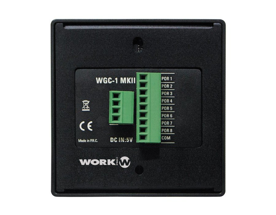 WGC1 MKII is a wall-mount controller used to close GPIs (General Purpose Inputs) associated with control devices. In this way we can execute the actions associated with these GPIs, such as: lighting changes, movement of relays, sending UDP or TCP commands, etc